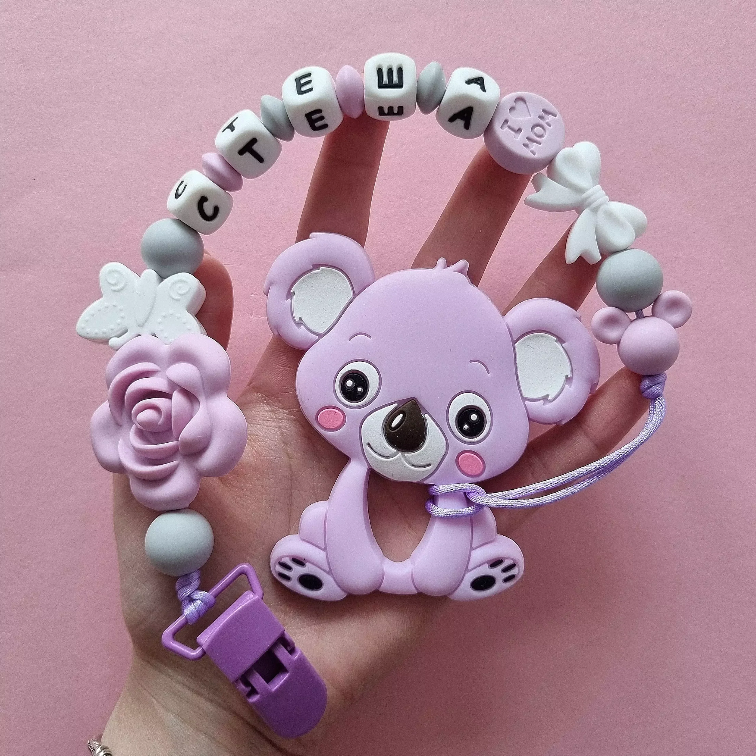 Чарівний дитячий гризунець із харчового силікону у вигляді коали— чудовий супутник для вашого малюка під час прорізування зубів. М’яка текстура силікону дбайливо масажує ясна, допомагаючи полегшити біль. Головним елементом цього гризунця є мила коала, яка викликає посмішку у дітей. Ви можете обрати бусини та декоративні елементи на свій смак, щоб створити унікальний аксесуар для вашого малюка. Всі деталі виготовлені з безпечного, нетоксичного матеріалу, що відповідає найвищим стандартам якості. Іменна персоналізація додає особливої індивідуальності, роблячи цей гризунець ідеальним подарунком.