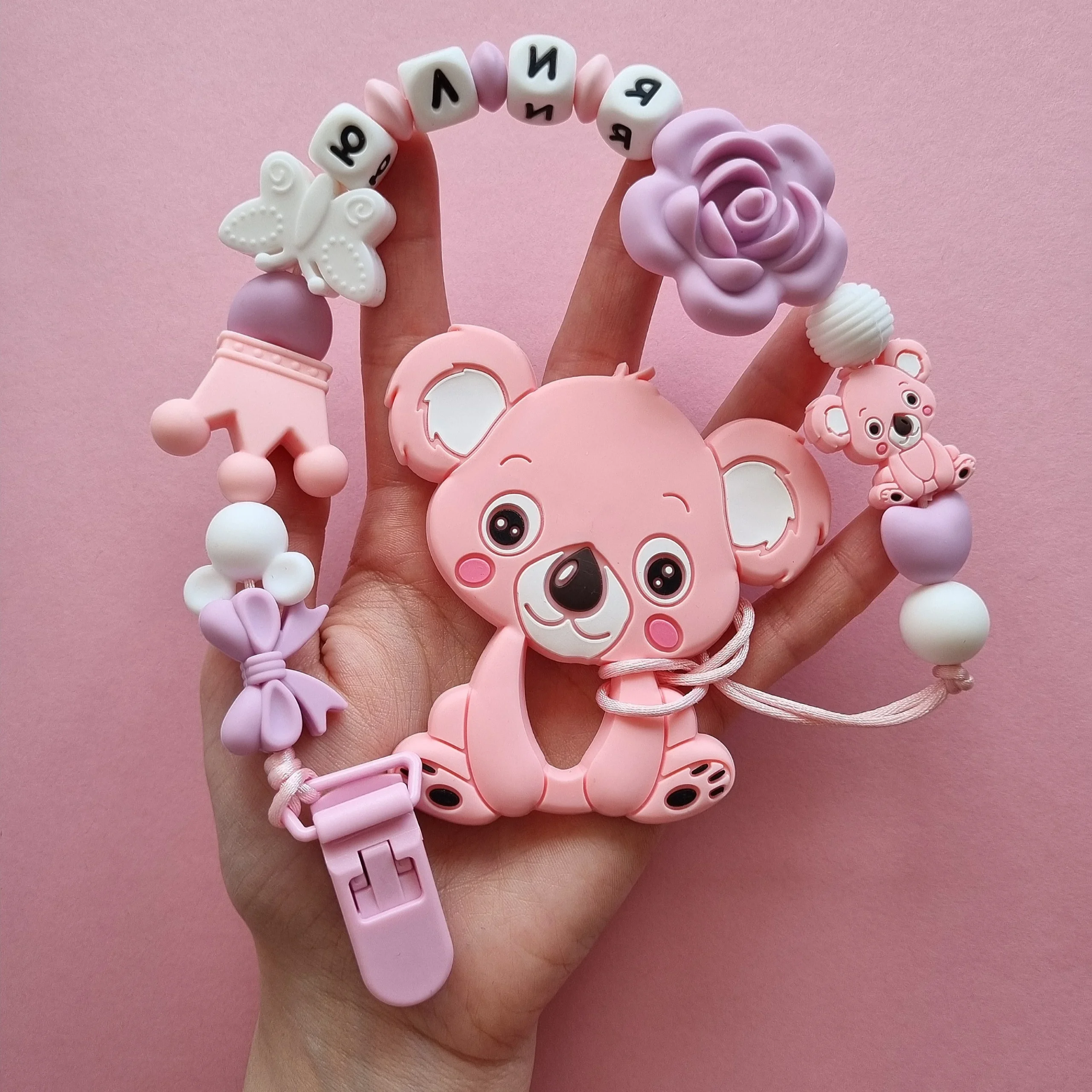 Чарівний дитячий гризунець із харчового силікону у вигляді коали— чудовий супутник для вашого малюка під час прорізування зубів. М’яка текстура силікону дбайливо масажує ясна, допомагаючи полегшити біль. Головним елементом цього гризунця є мила коала, яка викликає посмішку у дітей. Ви можете обрати бусини та декоративні елементи на свій смак, щоб створити унікальний аксесуар для вашого малюка. Всі деталі виготовлені з безпечного, нетоксичного матеріалу, що відповідає найвищим стандартам якості. Іменна персоналізація додає особливої індивідуальності, роблячи цей гризунець ідеальним подарунком.