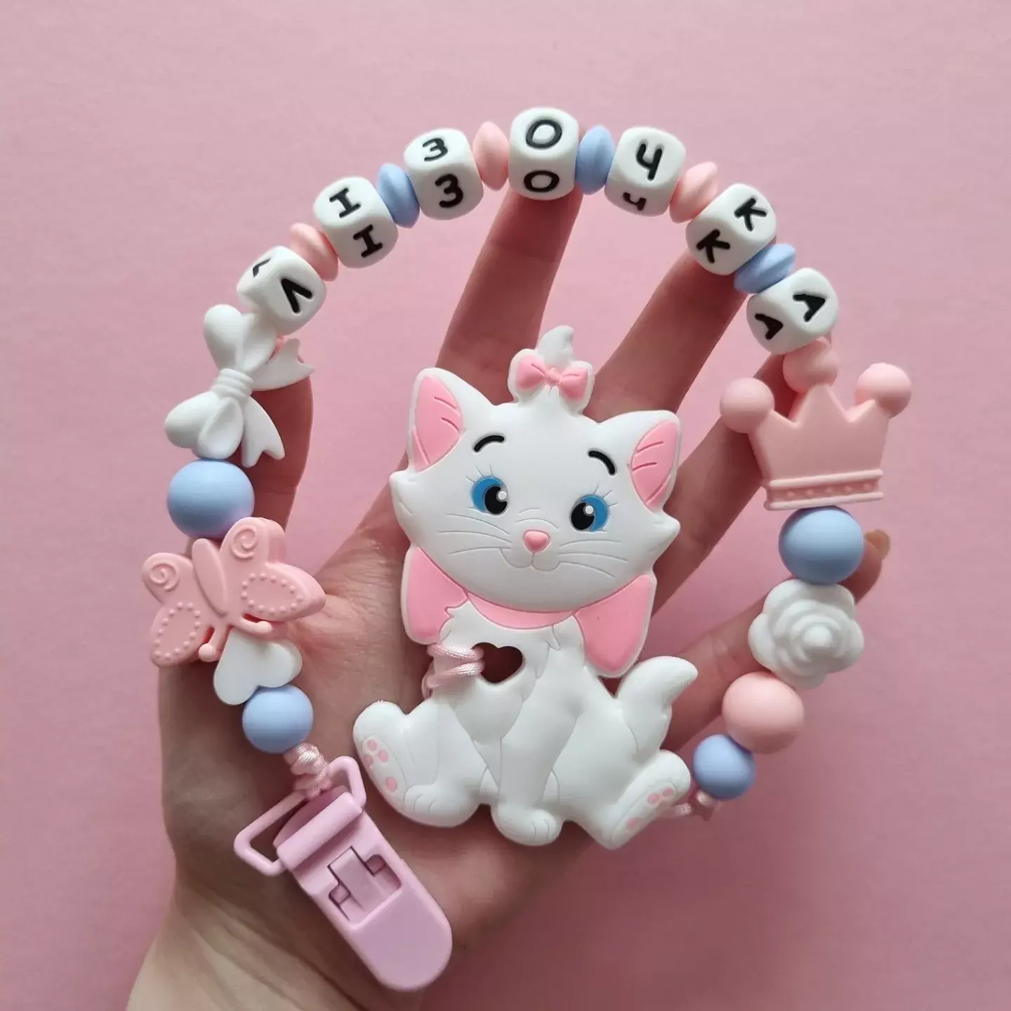 Чарівний дитячий гризунець із харчового силікону у вигляді котика— чудовий супутник для вашого малюка під час прорізування зубів. М’яка текстура силікону дбайливо масажує ясна, допомагаючи полегшити біль. Головним елементом цього гризунця є миле кошеня, яке викликає посмішку у дітей. Ви можете обрати бусини та декоративні елементи на свій смак, щоб створити унікальний аксесуар для вашого малюка. Всі деталі виготовлені з безпечного, нетоксичного матеріалу, що відповідає найвищим стандартам якості. Іменна персоналізація додає особливої індивідуальності, роблячи цей гризунець ідеальним подарунком.