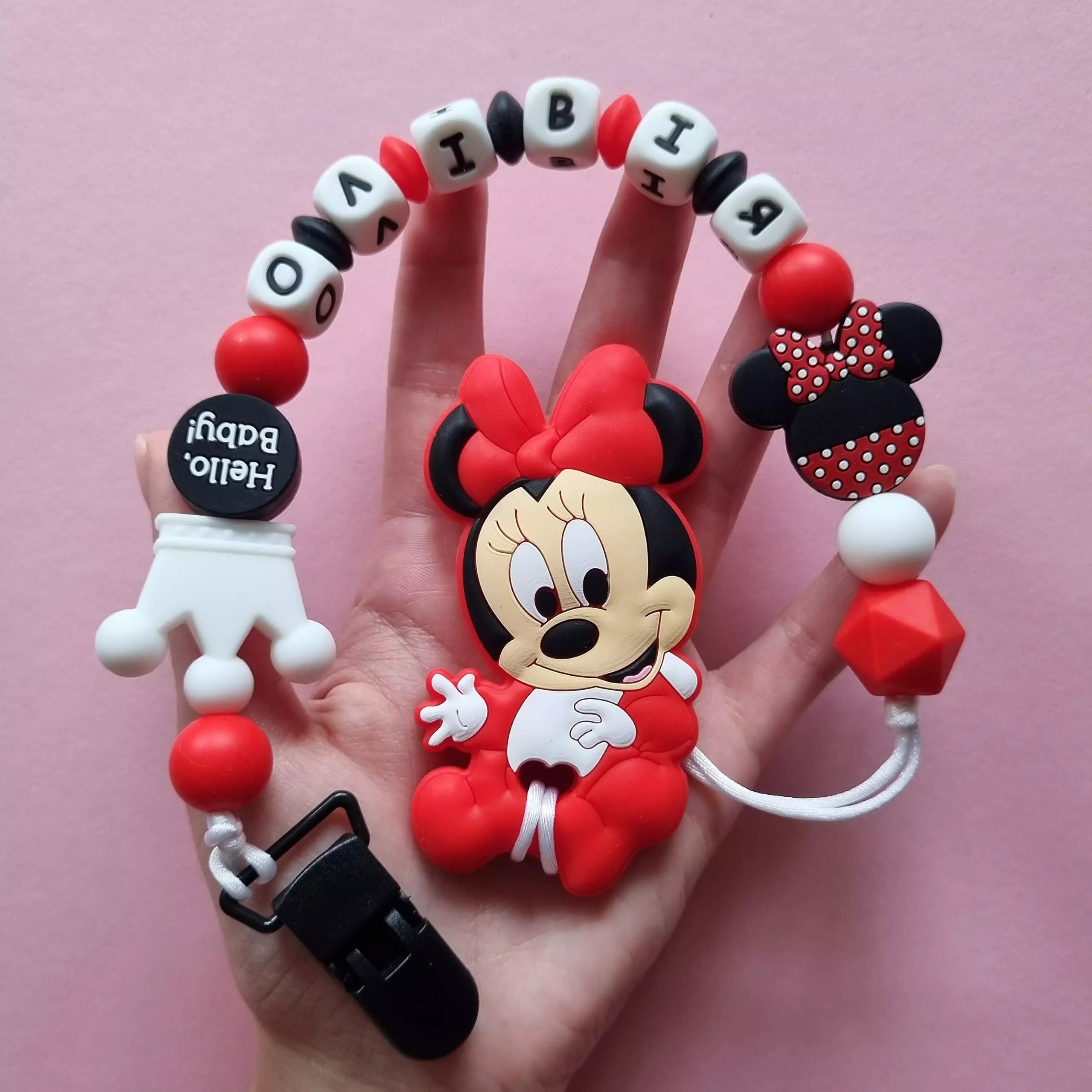 Дитячий гризунець із харчового силікону у вигляді чарівної Мінні Маус — ідеальний помічник для малюків під час прорізування зубів. Мінні Маус завжди залишається головним елементом, додаючи чарівності, тоді як бусини та декоративні елементи можуть змінюватися за вашим бажанням. Це дозволяє створити унікальний дизайн для кожної дитини. Всі деталі виготовлені з безпечного харчового силікону, який не містить шкідливих речовин і чудово підходить для заспокоєння ясен під час прорізування зубів. Персоналізований напис робить гризунець не тільки корисним, а й модним аксесуаром для вашої дитини.