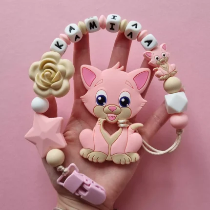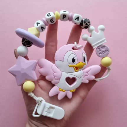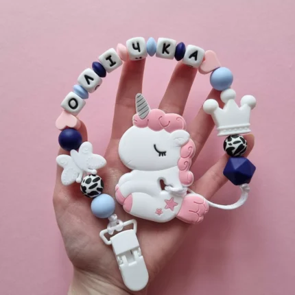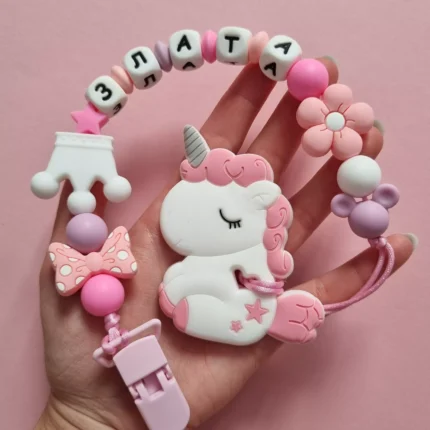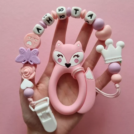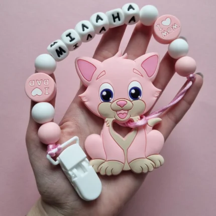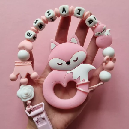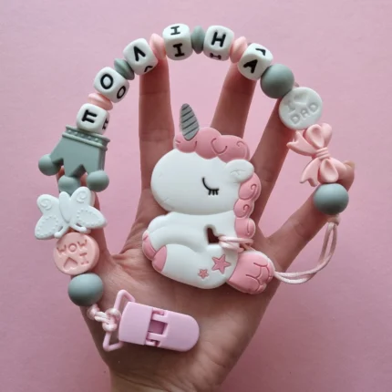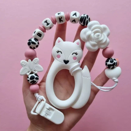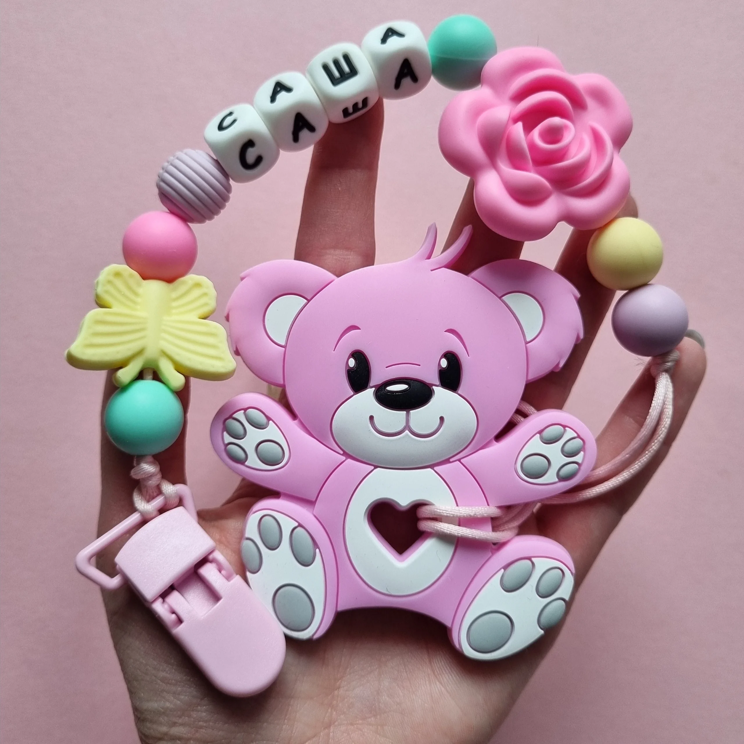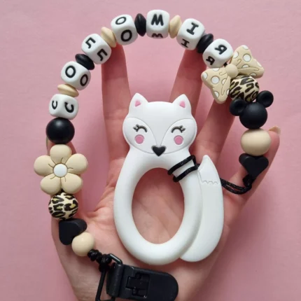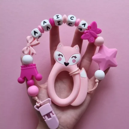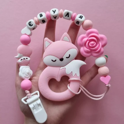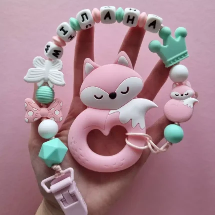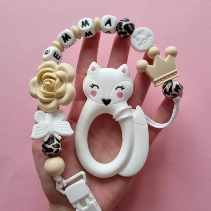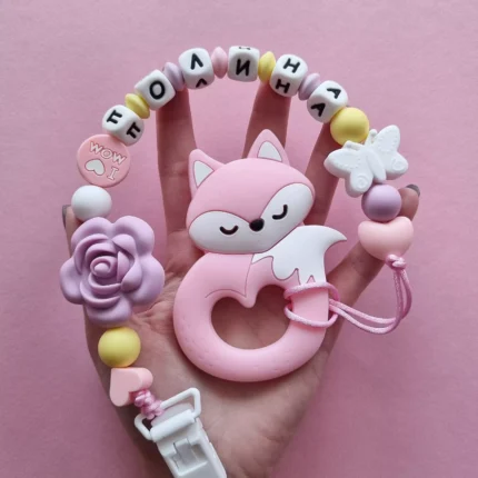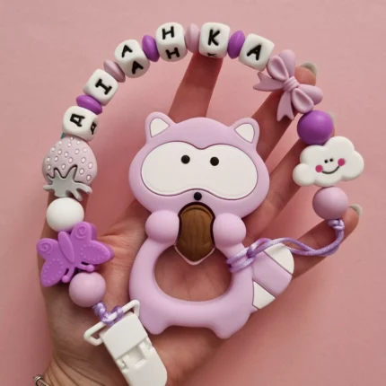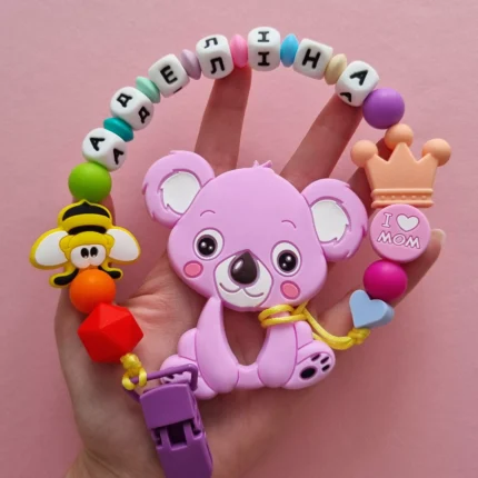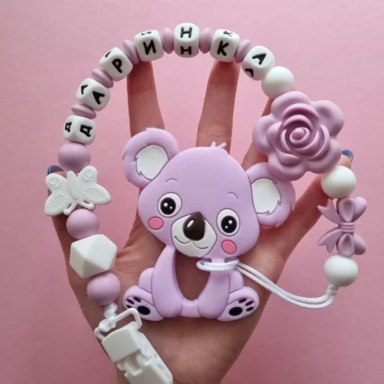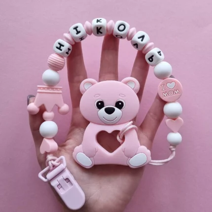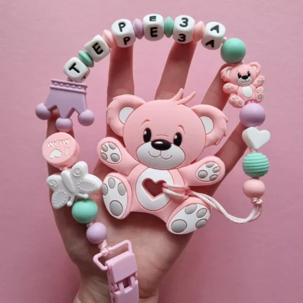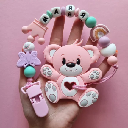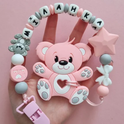 Чарівний дитячий гризунець із харчового силікону у вигляді ведмедика— чудовий супутник для вашого малюка під час прорізування зубів. М’яка текстура силікону дбайливо масажує ясна, допомагаючи полегшити біль. Головним елементом цього гризунця є миле ведмежа, яке викликає посмішку у дітей. Ви можете обрати бусини та декоративні елементи на свій смак, щоб створити унікальний аксесуар для вашого малюка. Всі деталі виготовлені з безпечного, нетоксичного матеріалу, що відповідає найвищим стандартам якості. Іменна персоналізація додає особливої індивідуальності, роблячи цей гризунець ідеальним подарунком.