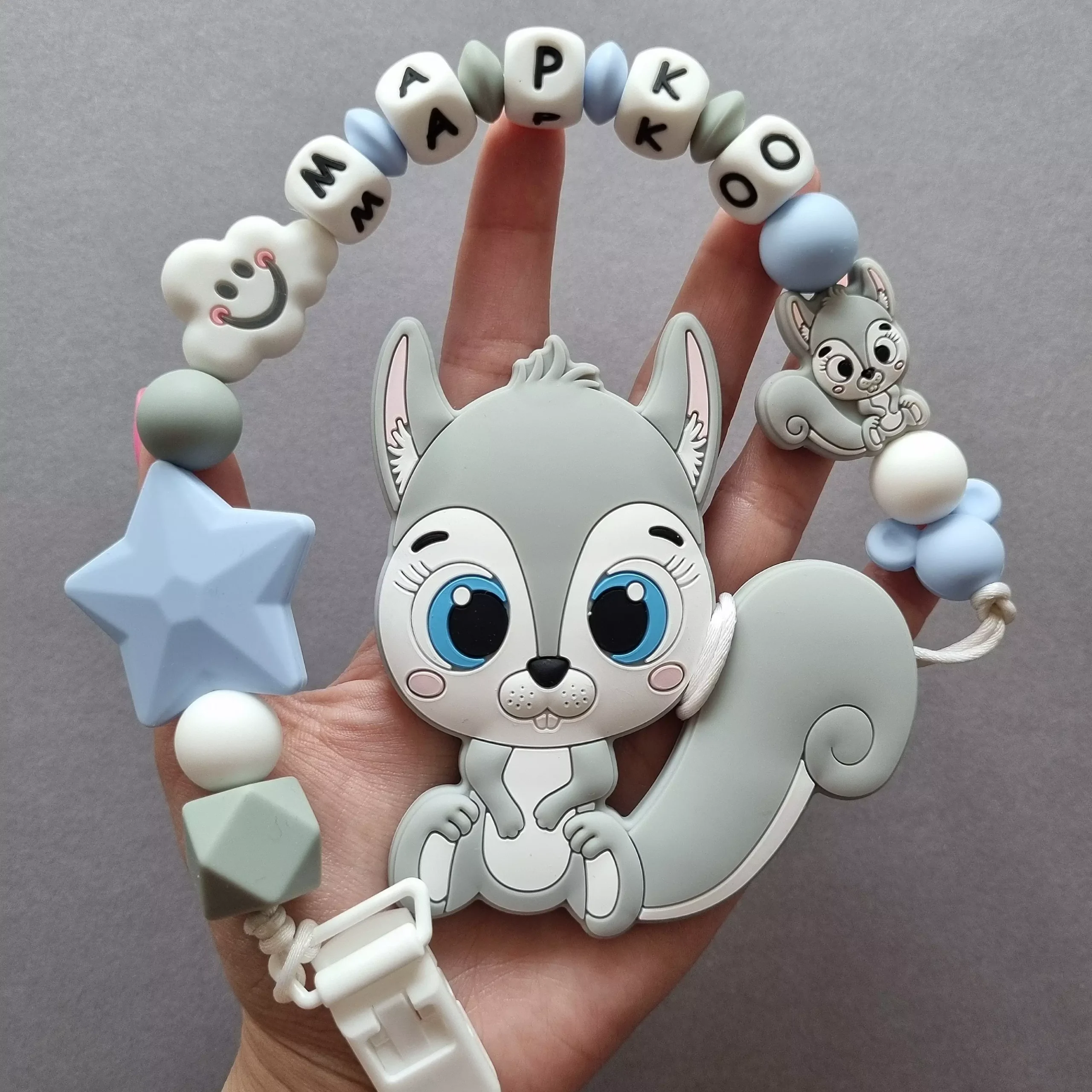 Чарівний дитячий гризунець із харчового силікону у вигляді білочки— чудовий супутник для вашого малюка під час прорізування зубів. М’яка текстура силікону дбайливо масажує ясна, допомагаючи полегшити біль. Головним елементом цього гризунця є мила білочка, яка викликає посмішку у дітей. Ви можете обрати бусини та декоративні елементи на свій смак, щоб створити унікальний аксесуар для вашого малюка. Всі деталі виготовлені з безпечного, нетоксичного матеріалу, що відповідає найвищим стандартам якості. Іменна персоналізація додає особливої індивідуальності, роблячи цей гризунець ідеальним подарунком.