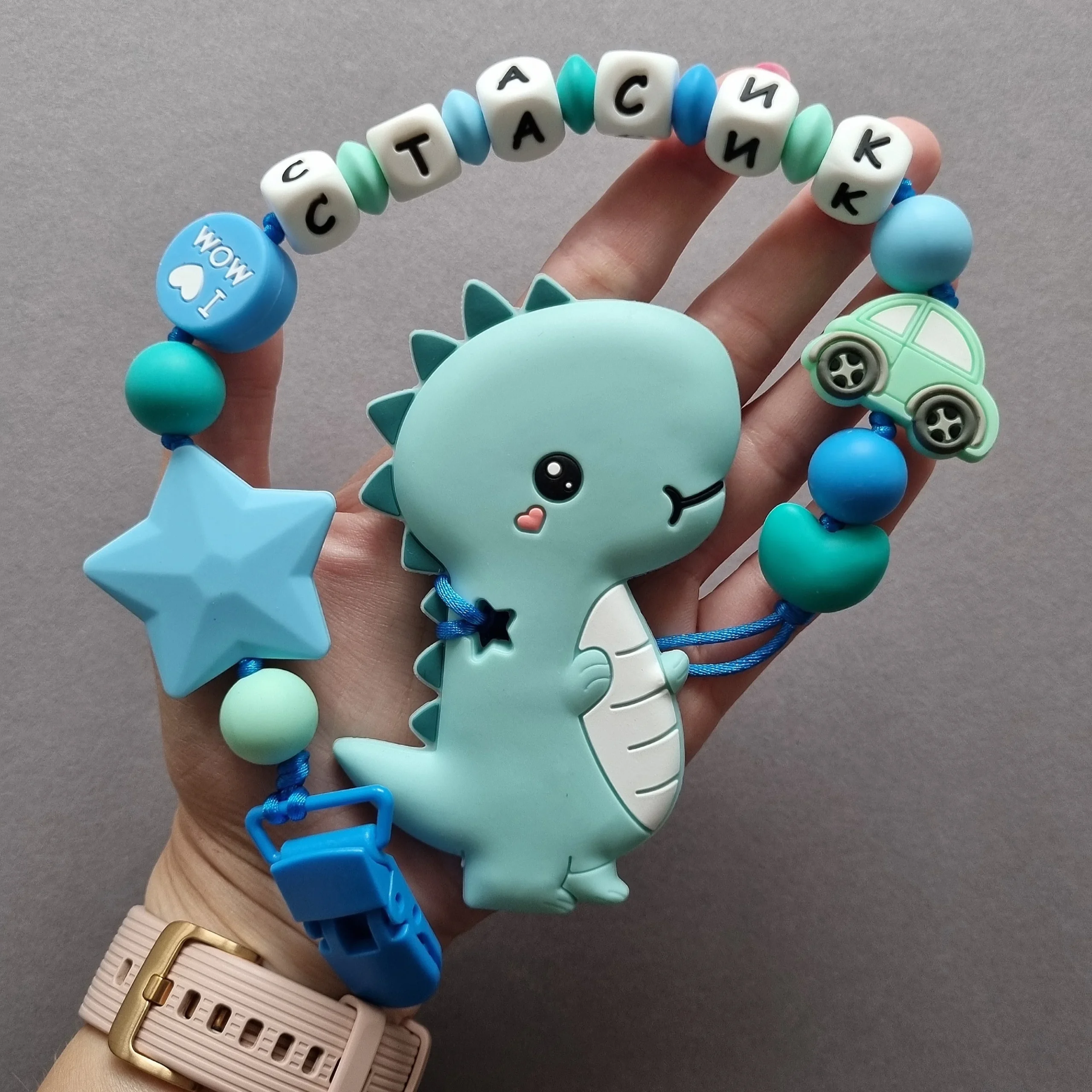 Чарівний дитячий гризунець із харчового силікону у вигляді динозавра— чудовий супутник для вашого малюка під час прорізування зубів. М’яка текстура силікону дбайливо масажує ясна, допомагаючи полегшити біль. Головним елементом цього гризунця є милий динозаврик, який викликає посмішку у дітей. Ви можете обрати бусини та декоративні елементи на свій смак, щоб створити унікальний аксесуар для вашого малюка. Всі деталі виготовлені з безпечного, нетоксичного матеріалу, що відповідає найвищим стандартам якості. Іменна персоналізація додає особливої індивідуальності, роблячи цей гризунець ідеальним подарунком.