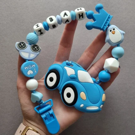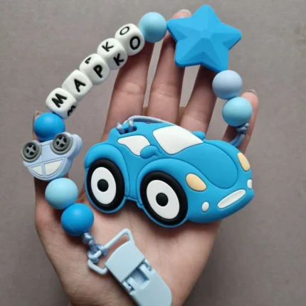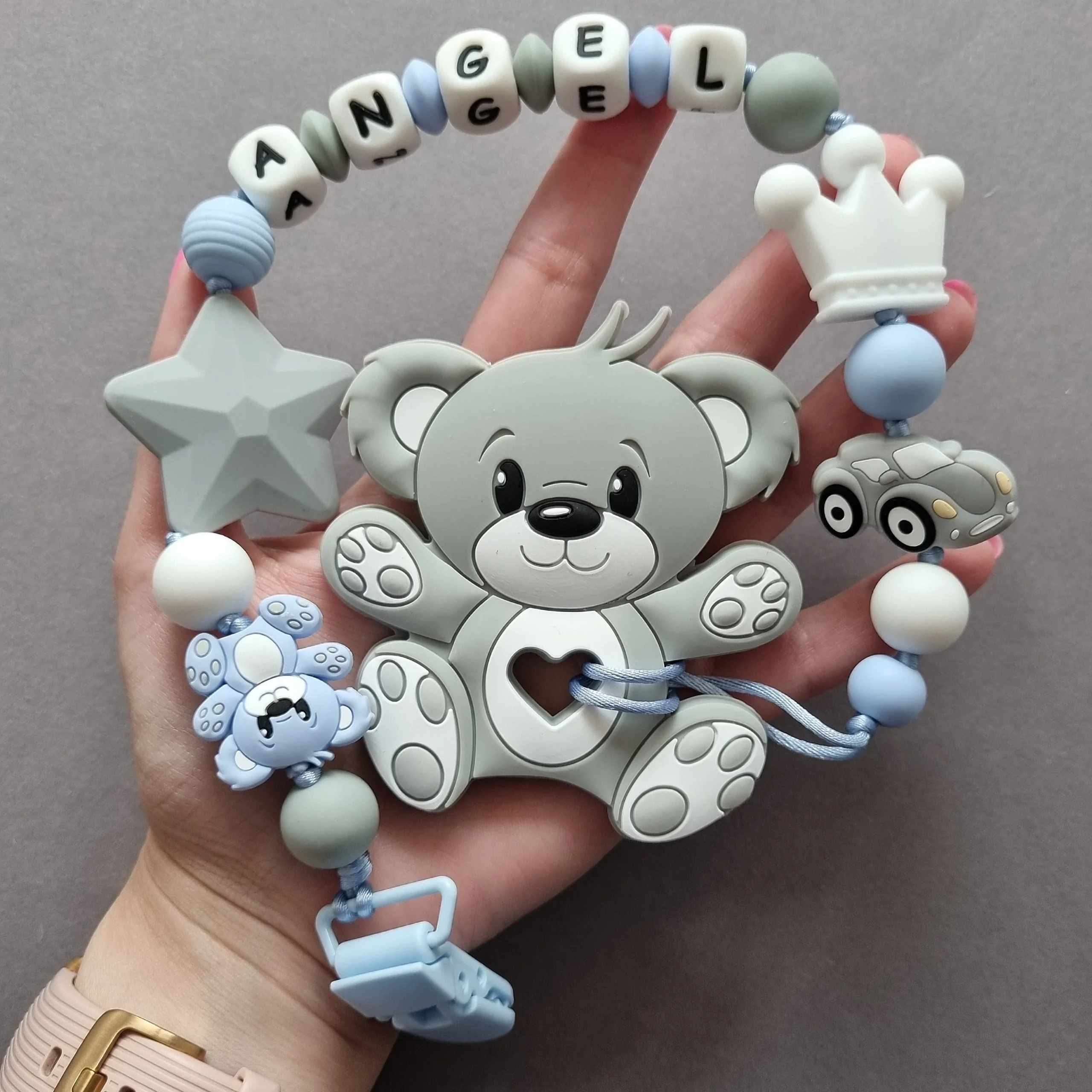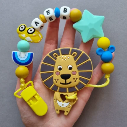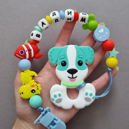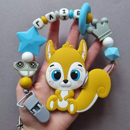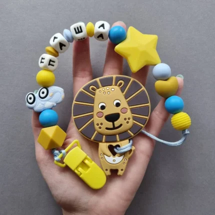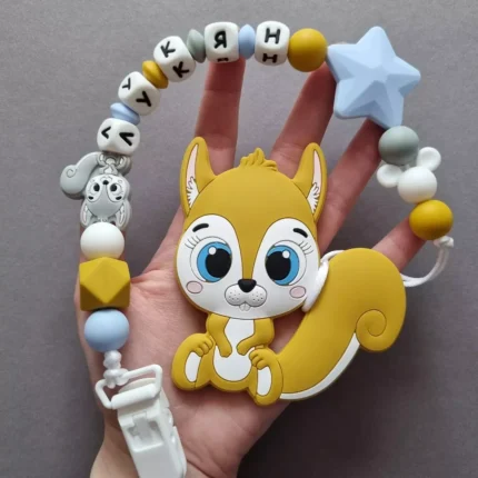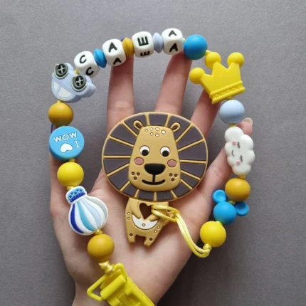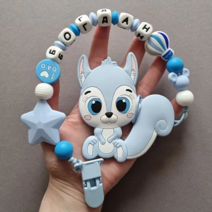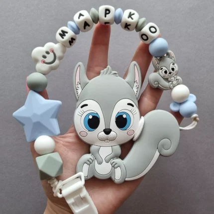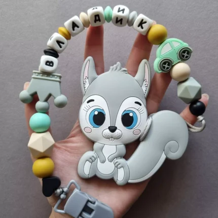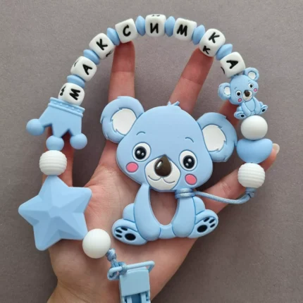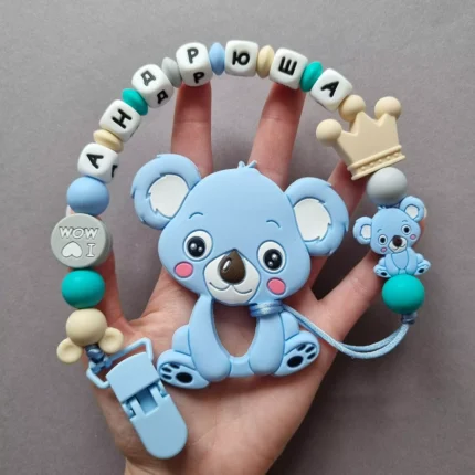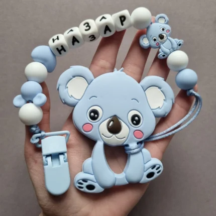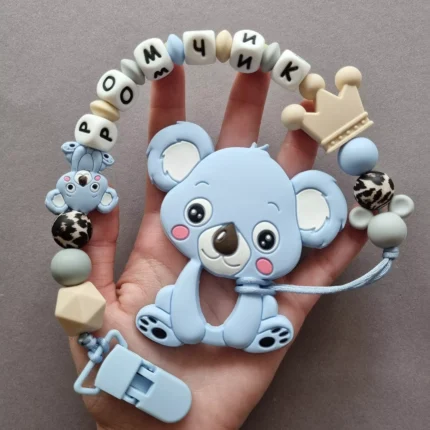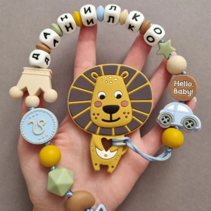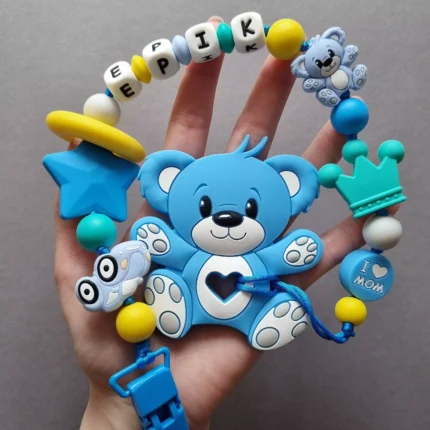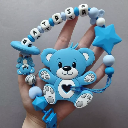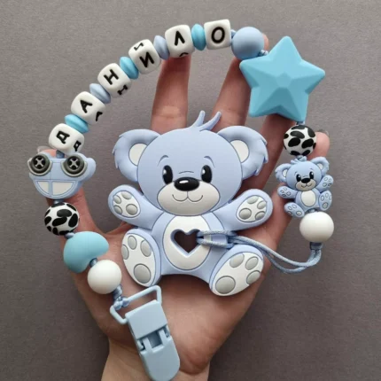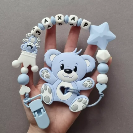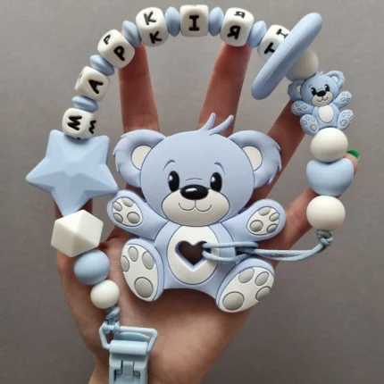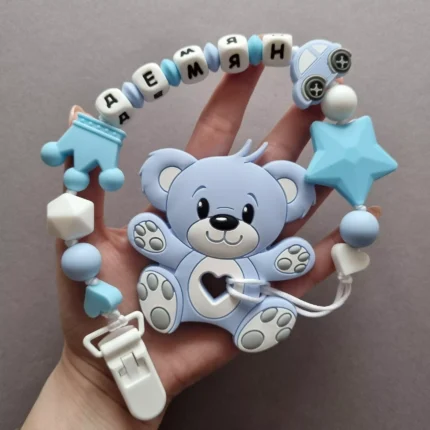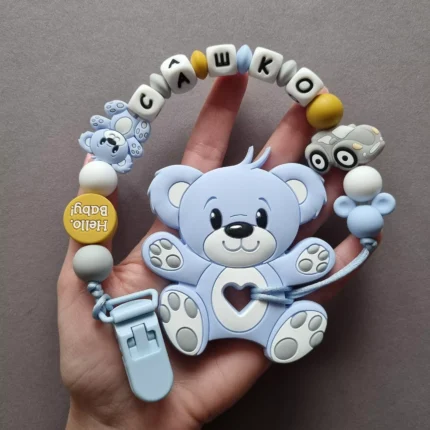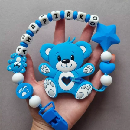 Чарівний дитячий гризунець із харчового силікону у вигляді ведмедика— чудовий супутник для вашого малюка під час прорізування зубів. М’яка текстура силікону дбайливо масажує ясна, допомагаючи полегшити біль. Головним елементом цього гризунця є миле ведмежа, яке викликає посмішку у дітей. Ви можете обрати бусини та декоративні елементи на свій смак, щоб створити унікальний аксесуар для вашого малюка. Всі деталі виготовлені з безпечного, нетоксичного матеріалу, що відповідає найвищим стандартам якості. Іменна персоналізація додає особливої індивідуальності, роблячи цей гризунець ідеальним подарунком.