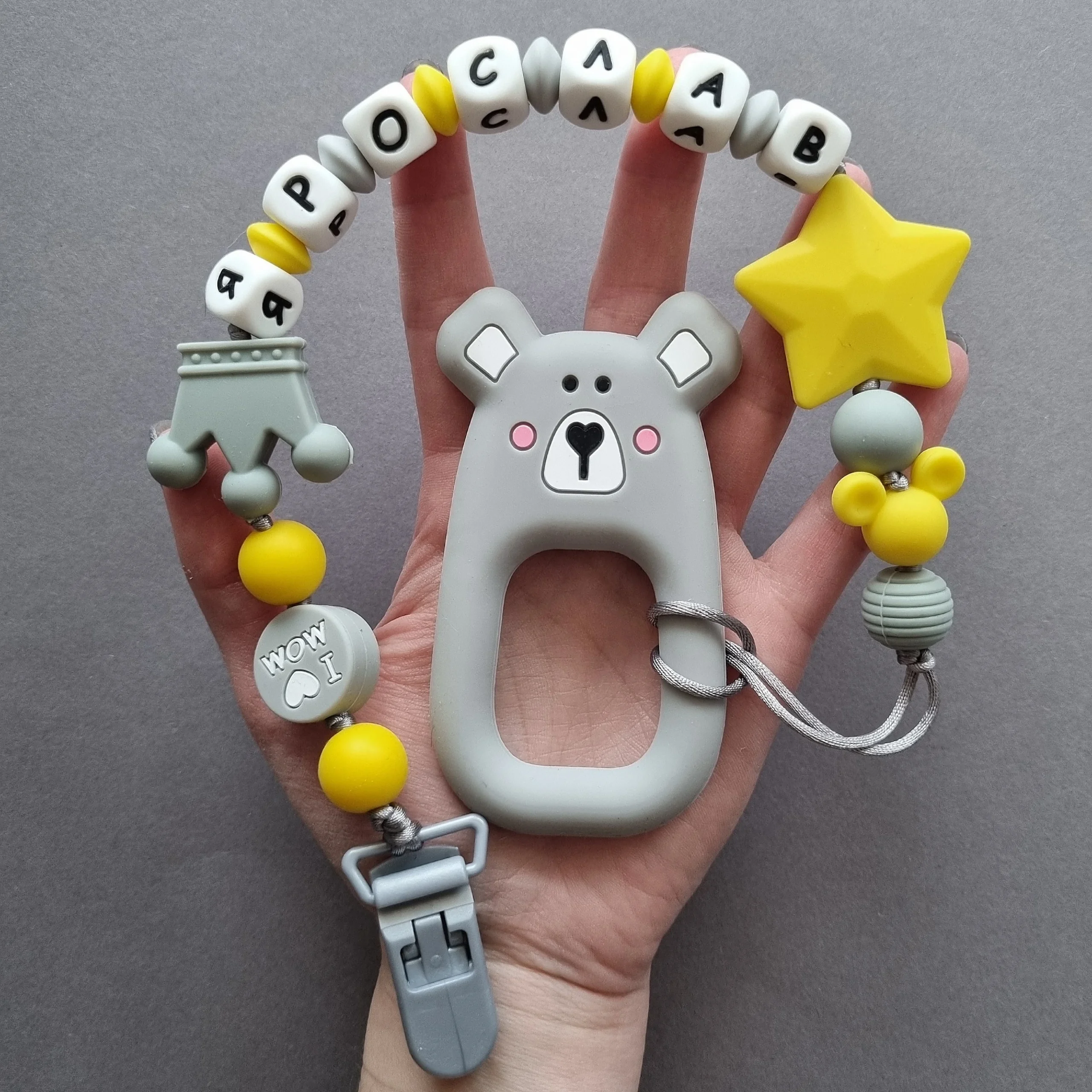 Чарівний дитячий гризунець із харчового силікону у вигляді ведмедика— чудовий супутник для вашого малюка під час прорізування зубів. М’яка текстура силікону дбайливо масажує ясна, допомагаючи полегшити біль. Головним елементом цього гризунця є миле ведмежа, яке викликає посмішку у дітей. Ви можете обрати бусини та декоративні елементи на свій смак, щоб створити унікальний аксесуар для вашого малюка. Всі деталі виготовлені з безпечного, нетоксичного матеріалу, що відповідає найвищим стандартам якості. Іменна персоналізація додає особливої індивідуальності, роблячи цей гризунець ідеальним подарунком.
