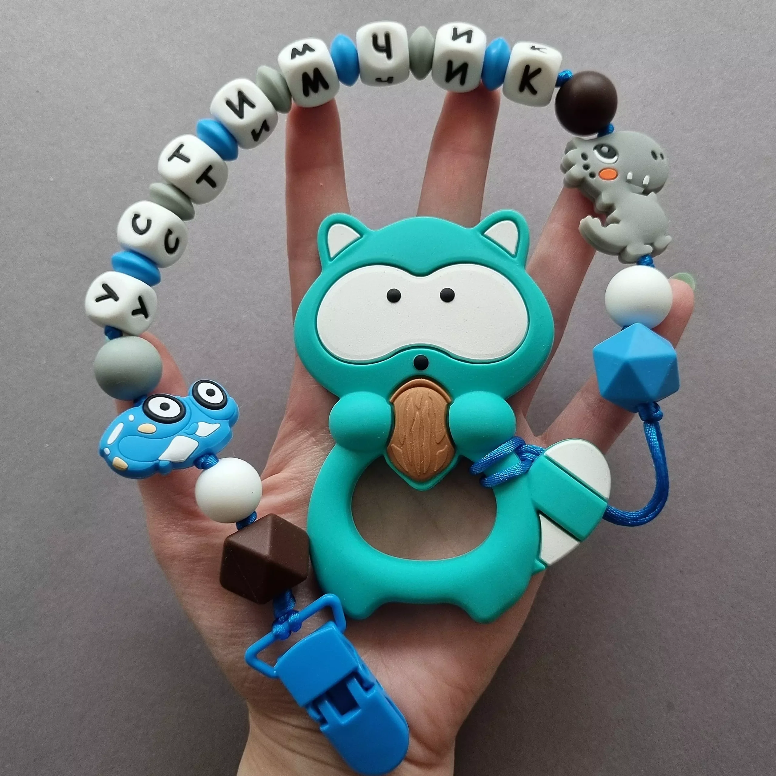 Чарівний дитячий гризунець із харчового силікону у вигляді єнота— чудовий супутник для вашого малюка під час прорізування зубів. М’яка текстура силікону дбайливо масажує ясна, допомагаючи полегшити біль. Головним елементом цього гризунця є милий єнотик, який викликає посмішку у дітей. Ви можете обрати бусини та декоративні елементи на свій смак, щоб створити унікальний аксесуар для вашого малюка. Всі деталі виготовлені з безпечного, нетоксичного матеріалу, що відповідає найвищим стандартам якості. Іменна персоналізація додає особливої індивідуальності, роблячи цей гризунець ідеальним подарунком.