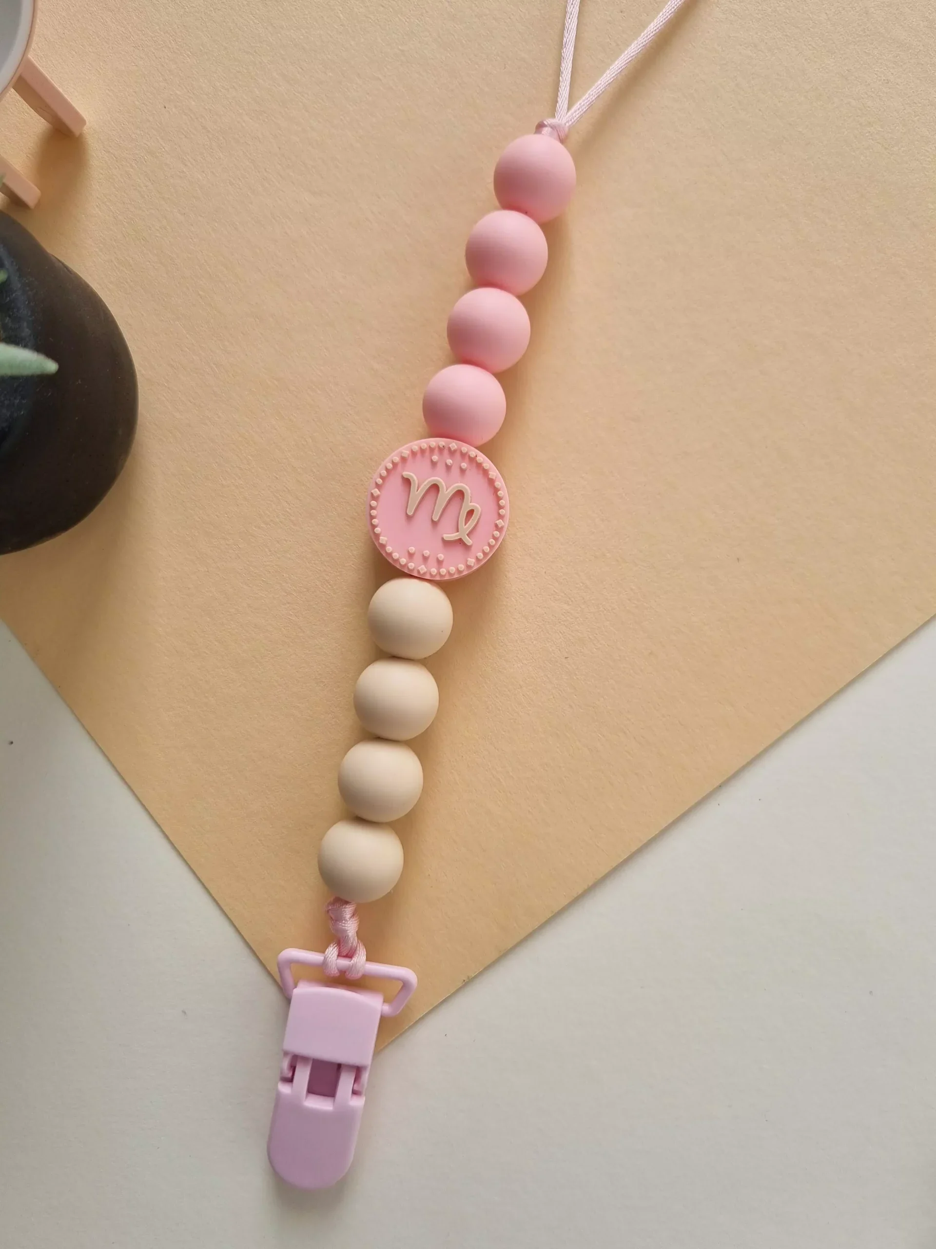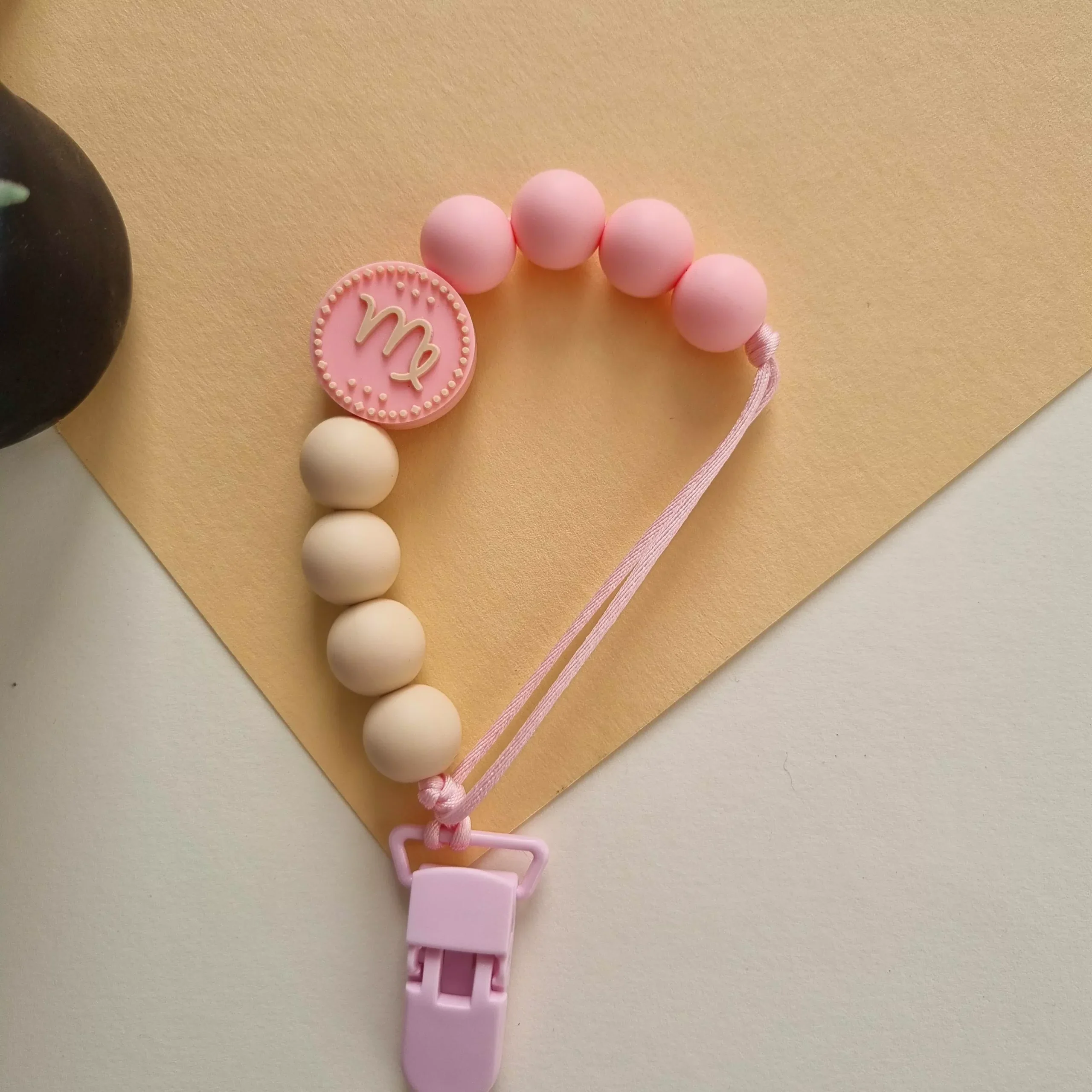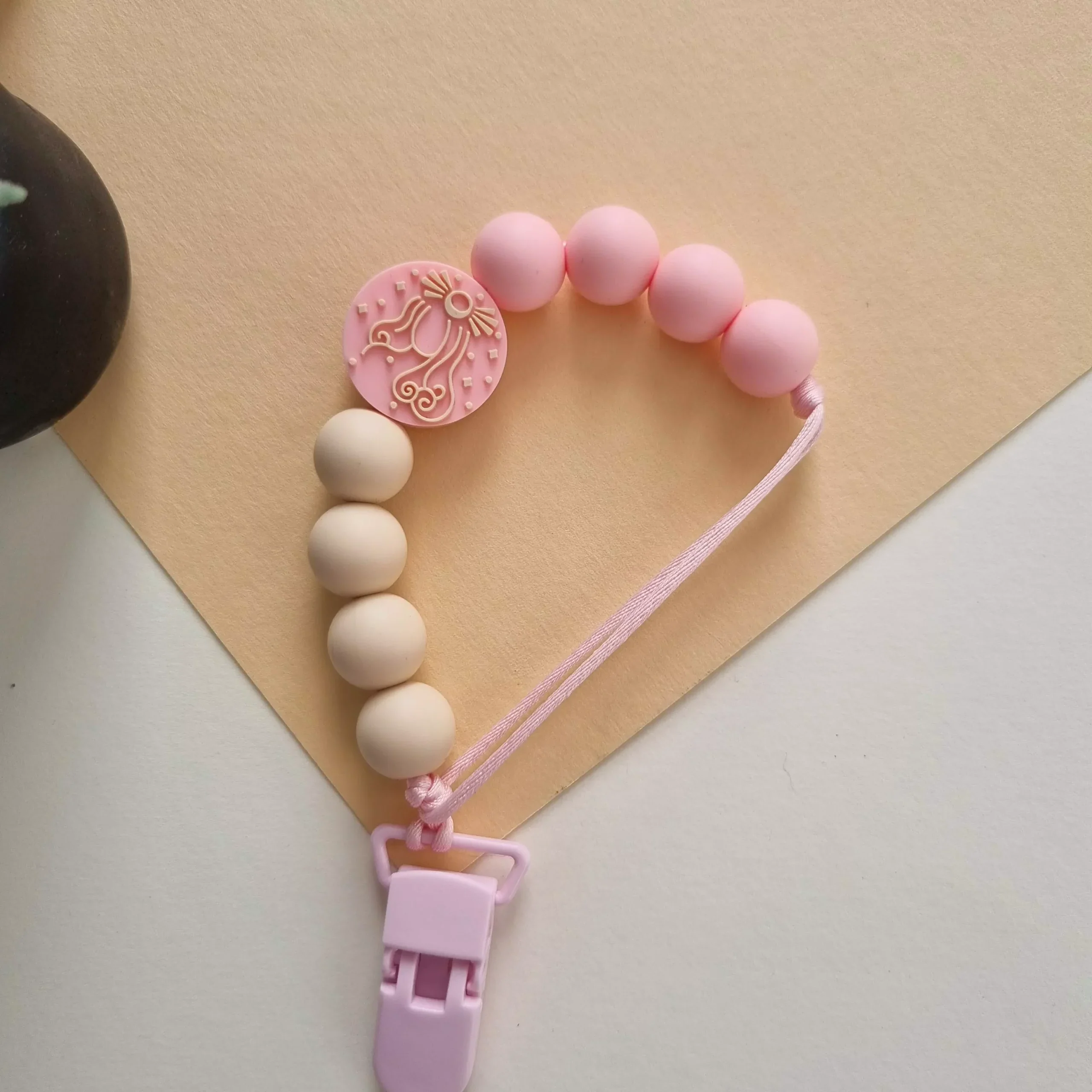 Цей стильний і зручний тримач для пустушки допоможе запобігти її падінню на підлогу або втраті. Він виготовлений із м’яких та безпечних силіконових намистин, які також можуть використовуватися як прорізувач для зубів. Завдяки надійній застібці тримач легко кріпиться до одягу малюка, забезпечуючи комфорт та безпеку. Тримач доступний у різних кольорах і дизайнах, що підійде до стилю вашого малюка, зокрема з елементами, що імітують зодіакальні знаки або яскраві образи.